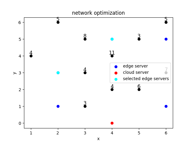 Question 2: When the edge servers cannot meet the computational demand, upstream cloud servers will provide the necessary computing services. Now, a cloud server is added outside the grid area, and both end nodes and edge servers can choose to connect to the cloud node. When the computational demand received by the edge server exceeds its capacity, the excess demand will be directly allocated to the cloud server. The computational demand of each end node must be met and can only be served by one server, which can be either a cloud node or an edge server. Since edge servers have a resource capacity limit, assume that the available computational resource capacity of each edge server is 12, and the available computational resource capacity of the cloud server is infinite, meaning that the cloud server’s available computational resource capacity is not considered. Servers have a certain coverage radius, with the edge server’s coverage radius assumed to be 3, and the cloud server’s coverage radius is infinite, meaning that the cloud server’s coverage range is not considered.